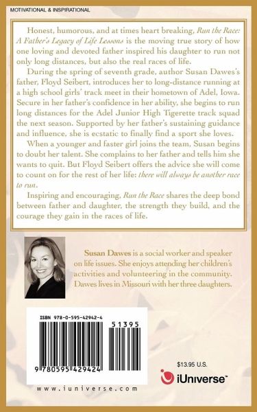 Honest, humorous, and at times heart breaking, Run the Race: A Father's Legacy of Life Lessons is the moving true story of how one loving and devoted father inspired his daughter to run not only long distances, but also the real races of life. During the spring of seventh grade, author Susan Dawes's father, Floyd Seibert, introduces her to long-distance running at a high school girls' track meet in their hometown of Adel, Iowa. Secure in her father's confidence in her ability, she begins to run long distances for the Adel Junior High Tigerette track squad the next season. Supported by her father's sustaining guidance and influence, she is ecstatic to finally find a sport she loves. When a younger and faster girl joins the team, Susan begins to doubt her talent. She complains to her father and tells him she wants to quit. But Floyd Seibert offers the advice she will come to count on for the rest of her life: there will always be another race to run. Inspiring and encouraging, Run the Race shares the deep bond between father and daughter, the strength they build, and the courage they gain in the races of life.