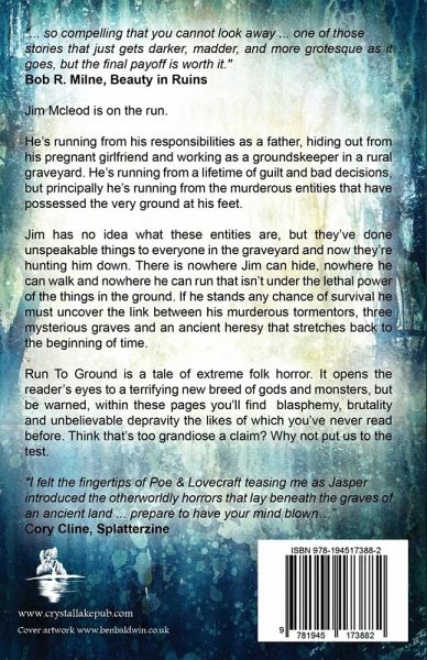 Jim Mcleod is on the run. He's running from his responsibilities as a father, hiding out from his pregnant girlfriend and working as a groundskeeper in a rural graveyard. He's running from a lifetime of guilt and bad decisions, but principally he's running from the murderous entities that have possessed the very ground at his feet. Jim has no idea what these entities are, but they've done unspeakable things to everyone in the graveyard and now they're hunting him down. There is nowhere Jim can hide, nowhere he can walk and nowhere he can run that isn't under the lethal power of the things in the ground. If he stands any chance of survival he must uncover the link between his murderous tormentors, three mysterious graves and an ancient heresy that stretches back to the beginning of time. Run To Ground is a tale of extreme folk horror. It opens the reader's eyes to a terrifying new breed of gods and monsters, but be warned, within these pages you'll find blasphemy, brutality and unbelievable depravity the likes of which you've never read before. Think that's too grandiose a claim? Why not put us to the test. Go on, click the 'Buy now' button, we double dare you...