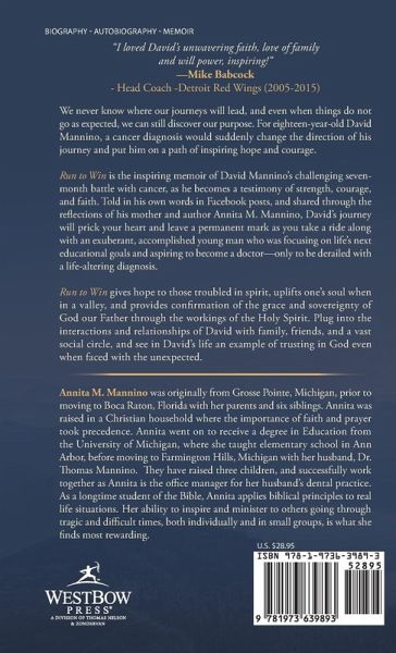 "I loved David's unwavering faith, love of family and will power, inspiring!" -Mike Babcock - Head Coach -Detroit Red Wings (2005-2015) We never know where our journeys will lead, and even when things do not go as expected, we can still discover our purpose. For eighteen-year-old David Mannino, a cancer diagnosis would suddenly change the direction of his journey and put him on a path of inspiring hope and courage. Run to Win is the inspiring memoir of David Mannino's challenging seven-month battle with cancer, as he becomes a testimony of strength, courage, and faith. Told in his own words in Facebook posts, and shared through the reflections of his mother and author Annita M. Mannino, David's journey will prick your heart and leave a permanent mark as you take a ride along with an exuberant, accomplished young man who was focusing on life's next educational goals and aspiring to become a doctor-only to be derailed with a life-altering diagnosis. Run to Win gives hope to those troubled in spirit, uplifts one's soul when in a valley, and provides confirmation of the grace and sovereignty of God our Father through the workings of the Holy Spirit. Plug into the interactions and relationships of David with family, friends, and a vast social circle, and see in David's life an example of trusting in God even when faced with the unexpected.
