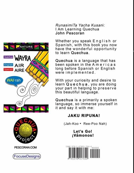 Whether you speak English or Spanish, with this book you now have the wonderful opportunity to learn Quechua. Quechua is a language that has been spoken in the Americas long before Spanish or English were implemented. Quechua was the official language of the Inca Empire. With your curiosity and desire to learn Quechua, you are doing your part in helping to preserve this beautiful language. Quechua is a primarily a spoken language, so immerse yourself in it and say it with me: JAKU RIPUNA! ¿ Let's Go! ¿ ¡Vámonos!