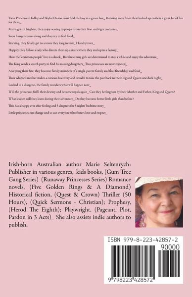 Twin Princesses Hadley and Skylar Onion must find the boy in a green box_ Running away from their locked up castle is a great bit of fun for them_ Roaring with laughter, they enjoy waving to people from their lion and tiger costumes_ Soon hunger comes along and they try to find food_ Starving, they finally get to a town they long to visit_ Hunchytown_ Happily they follow a lady who directs them up a stairs where they end up in a factory_ How the "common people" live is a shock_ But these zany girls are determined to stay a while and enjoy the adventure_ The King sends a search party to find his missing daughters_ Two princesses are now rejected_ Accepting their fate, they become family members of a single-parent family and find friendship and food_ Their adopted mother makes a curious discovery and decides to take the pair back to the King and Queen one dark night_ Locked in a dungeon, the family wonders what will happen next_ Will the princesses fulfil their destiny and become royals again_ Can they be forgiven by their Mother and Father, King and Queen? What lessons will they learn during their adventure_ Do they become better little girls than before? This has a happy ever after feeling and 5 chapters for 5 nights' bedtime story_ Little princesses can change and so can everyone who fosters love and respect_