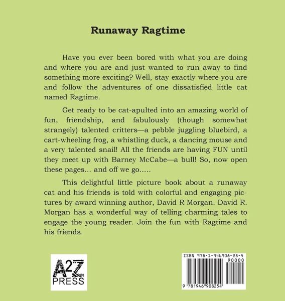 A charming 32 page children's picture book filled with colorful pictures. David R. Morgan tells the story of Runaway Ragtime, an unhappy kitten on a search for adventure. Along the way, Ragtime meets many friends who also want to have an adventure. The friends come across an angry bull and things change quickly! Come see how Ragtime and friends escape the bull and find their way home where they belong.