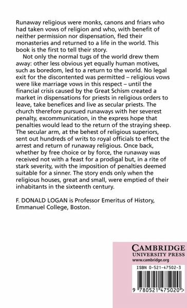 The 'runaway religious' were monks, canons and friars who had taken vows of religion and who, with benefit of neither permission nor dispensation, fled their monasteries and returned to a life in the world, usually replacing the religious habit with lay clothes. No legal exit for the discontented was permitted - religious vows were like marriage vows in this respect - until the financial crisis caused by the Great Schism created a market in dispensations for priests in religious orders to leave, take benefices, and live as secular priests. The church therefore pursued runaways with her severest penalty, excommunication, in the express hope that penalties would lead to the return of the straying sheep. Once back, whether by free choice or by force, the runaway was received not with a feast for a prodigal but, in a rite of stark severity, with the imposition of penalties deemed suitable for a sinner.