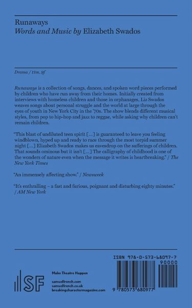 Runaways is a collection of songs, dances, and spoken word pieces performed by children who have run away from their homes. Initially created from interviews with homeless children and those in orphanages, Liz Swados' unique piece weaves songs about personal struggle and the world at large through the eyes of youth in New York City in the '70s. The show blends different musical styles, from pop to hip-hop and jazz to reggae, while asking why children can't remain children. The licensed version of Runaways reflects the version performed by Encores in 2016.