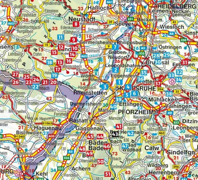 Gleich vor den Toren Karlsruhes locken die sanften Hügel von Pfinzgau und Kraichgau mit idyllischen Hohlwegen, Weinbergen und urigen Besenwirtschaften - nicht umsonst wird die Region die "Toskana Deutschlands" genannt. Auf der anderen Rheinseite, in der Südpfalz, führen sandige Wege unter Edelkastanien zu bizarren Sandsteinformationen und mittelalterlichen Burgruinen. Jenseits der Grenze zu Frankreich, im Elsass, warten spektakuläre Felsenpfade und waghalsige Treppen zu historischen Ruinen. Der Nordschwarzwald zwischen dem Murgtal und dem Albtal beeindruckt mit dunklen Tannenwäldern, kahlen Grinden, mystischen Moor-Seen und alpin anmutenden Tälern. Wer Ruhe sucht, wird in den naturbelassenen Rheinauen südlich und nördlich von Karlsruhe fündig.