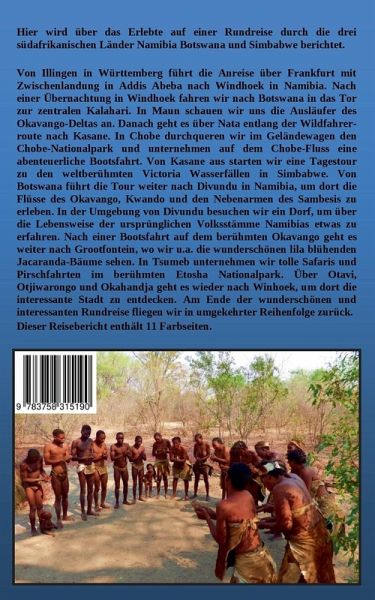 Hier wird über das Erlebte auf einer Rundreise durch die drei südafrikanischen Länder Namibia Botswana und Simbabwe berichtet.Von Illingen in Württemberg führt die Anreise über Frankfurt mit Zwischenlandung in Addis Abeba nach Windhoek in Namibia. Nach einer Übernachtung in Windhoek fahren wir nach Botswana in das Tor zur zentralen Kalahari. In Maun schauen wir uns die Ausläufer des Okavango-Deltas an. Danach geht es über Nata entlang der Wildfahrerroute nach Kasane. In Chobe durchqueren wir im Geländewagen den Chobe-Nationalpark und unternehmen auf dem Chobe-Fluss eine abenteuerliche Bootsfahrt. Von Kasane aus starten wir eine Tagestour zu den weltberühmten Victoria Wasserfällen in Simbabwe. Von Botswana führt die Tour weiter nach Divundu in Namibia, um dort die Flüsse des Okavango, Kwando und den Nebenarmen des Sambesis zu erleben. In der Umgebung von Divundu besuchen wir ein Dorf, um über die Lebensweise der ursprünglichen Volksstämme Namibias etwas zu erfahren. Nach einer Bootsfahrt auf dem berühmten Okavango geht es weiter nach Grootfontein, wo wir u.a. die wunderschönen lila blühenden Jacaranda-Bäume sehen. In Tsumeb unternehmen wir tolle Safaris und Pirschfahrten im berühmten Etosha Nationalpark. Über Otavi, Otjiwarongo und Okahandja geht es wieder nach Winhoek, um dort die interessante Stadt zu entdecken. Am Ende der wunderschönen und interessanten Rundreise fliegen wir in umgekehrter Reihenfolge zurück. Dieser Reisebericht enthält 11 Farbseiten. Ich hoffe sie haben Interesse bekommen und möchten mein Buch lesen, dazu wünsche ich viel Freude.