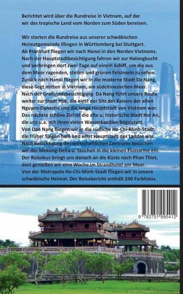 Berichtet wird über die Rundreise in Vietnam, auf der wir das tropische Land vom Norden zum Süden bereisen.Wir starten die Rundreise aus unserer schwäbischen Heimatgemeinde Illingen in Württemberg bei Stuttgart. Ab Frankfurt fliegen wir nach Hanoi in den Norden Vietnams. Nach der Hauptstadtbesichtigung fahren wir zur Halongbucht und verbringen dort zwei Tage auf einem Schiff, um die aus dem Meer ragenden, steilen und grünen Felsinseln zu sehen. Zurück nach Hanoi fliegen wir in die moderne Stadt Da Nang, diese liegt mitten in Vietnam, am südchinesischen Meer. Nach der Großstadtbesichtigung Da Nang führt unsere Route weiter zur Stadt Hue, die einst der Sitz des Kaisers der alten Nguyen-Dynastie und die lange Hauptstadt von Vietnam war. Das nächste schöne Ziel ist die alte u. historische Stadt Hoi An, die uns u.a. mit ihren vielen Wasserkanälen begeistert. Von Dan Nang fliegen wir in die südliche Ho-Chi-Minh-Stadt, die früher Saigon hieß und einst Hauptstadt des Landes war. Nach Besichtigung des wirtschaftlichen Zentrums besuchen wir das Mekong-Delta u. tauchen in die kleinen Flussarme ein. Der Reisebus bringt uns danach an die Küste nach Phan Thiet, dort genießen wir eine Woche im Strandhotel am Meer. Von der Metropole Ho-Chi-Minh-Stadt fliegen wir in unsere schwäbische Heimat. Der Reisebericht enthält 240 Farbfotos.