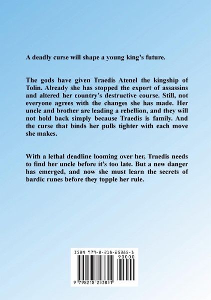 A deadly curse will shape a young king's future. The gods have given Traedis Atenel the kingship of Tolin. Already she has stopped the export of assassins and altered her country's destructive course. Still, not everyone agrees with the changes she has made. Her uncle and brother are leading a rebellion, and they will not hold back simply because Traedis is family. And the curse that binds her pulls tighter with each move she makes. With a lethal deadline looming over her, Traedis needs to find her uncle before it's too late. But a new danger has emerged, and now she must learn the secrets of bardic runes before they topple her rule.