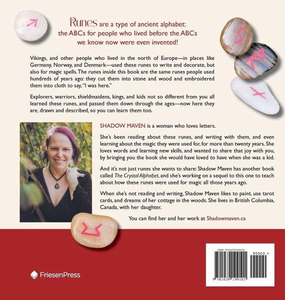 Shadow Maven is a woman who loves letters. She's been reading about these runes, and writing with them, and even learning about the magic they were used for, for more than twenty years. She loves words and learning new skills, and wanted to share that joy with you, by bringing you the book she would have loved to have when she was a kid. And it's not just runes she wants to share: Shadow Maven has another book called The Crystal Alphabet, and she's working on a sequel to this one to teach about how these runes were used for magic all those years ago. When she's not reading and writing, Shadow Maven likes to paint, use tarot cards, and dreams of her cottage in the woods. She lives in British Columbia, Canada, with her daughter. You can find her and her work at Shadowmaven.ca.