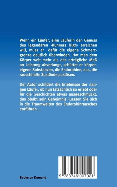 Wenn ein Läufer, eine Läuferin den Genuss des legendären "Runners High" erreichen will, muss er dafür die eigene Schmerzgrenze deutlich überwinden. Hat man dem Körper weit mehr als das erträgliche Maß an Leistung abverlangt, schüttet er körpereigene Substanzen, die Endorphine, aus, die rauschhafte Zustände auslösen.Der Autor schildert die Erlebnisse der "langen Läufe", ob nun tatsächlich so erlebt oder für die Geschichten etwas ausgeschmückt, das bleibt sein Geheimnis. Lassen Sie sich in die Traumwelten des Endorphinrausches entführen ...