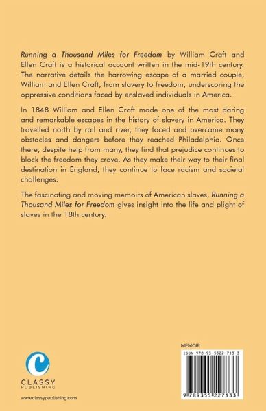 Running a Thousand Miles for Freedom by William Craft and Ellen Craft is a historical account written in the mid-19th century. The narrative details the harrowing escape of a married couple, William and Ellen Craft, from slavery to freedom, underscoring the oppressive conditions faced by enslaved individuals in America. In 1848 William and Ellen Craft made one of the most daring and remarkable escapes in the history of slavery in America. They travelled north by rail and river, they faced and overcame many obstacles and dangers before they reached Philadelphia. Once there, despite help from many, they find that prejudice continues to block the freedom they crave. As they make their way to their final destination in England, they continue to face racism and societal challenges. The fascinating and moving memoirs of American slaves, Running a Thousand Miles for Freedom gives insight into the life and plight of slaves in the 18th century.