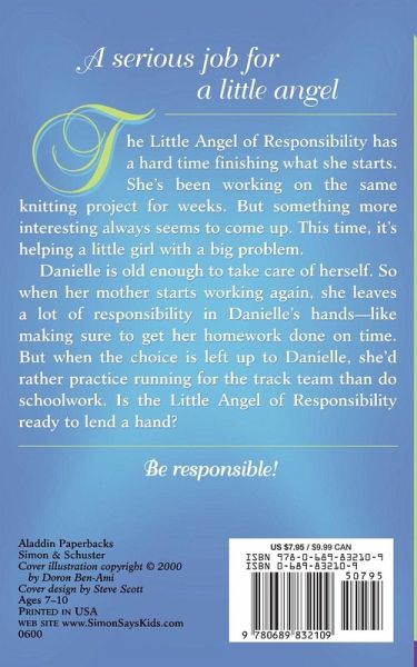 A serious job for a little angel The Little Angel of Responsibility has a hard time finishing what she starts. She?s been working on the same knitting project for weeks. But something more interesting always seems to come up. This time, it?s helping a little girl with a big problem. Danielle is old enough to take care of herself. So when her mother starts working again, she leaves a lot of responsibility in Danielle?s hands -- like making sure to get her homework done on time. But when the choice is left up to Danielle, she?d rather practice running for the track team than do schoolwork. Is the Little Angel of Responsibility ready to lend a hand? Be responsible!