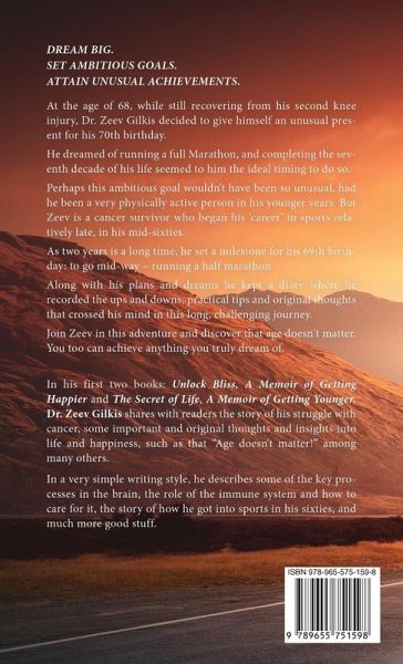 Dream big. Set ambitious goals. Attain unusual achievements.At the age of 68, while still recovering from his second knee injury, Dr. Zeev Gilkis decided to give himself an unusual present for his 70th birthday. He dreamed of running a full Marathon, and completing the seventh decade of his life seemed to him the ideal timing to do so. Perhaps this ambitious goal wouldn't have been so unusual, had he been a very physically active person in his younger years. But Zeev is a cancer survivor who began his 'career' in sports relatively late, in his mid-sixties. As two years is a long time, he set a milestone for his 69th birthday: to go mid-way - running a half marathon. Along with his plans and dreams he kept a diary where he recorded the ups and downs, practical tips and original thoughts that crossed his mind in this long, challenging journey. Join Zeev in this adventure and discover that age doesn't matter. You too can achieve anything you truly dream of. In his first two books: Unlock Bliss, A Memoir of Getting Happier and The Secret of Life, A Memoir of Getting Younger, Dr. Zeev Gilkis shares with readers the story of his struggle with cancer, some important and original thoughts and insights into life and happiness, such as that "Age doesn't matter!" among many others. In a very simple writing style, he describes some of the key processes in the brain, the role of the immune system and how to care for it, the story of how he got into sports in his sixties, and much more good stuff.