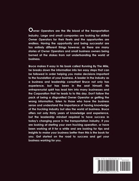 Bruce shares his secrets for a successful trucking business in his book titled Running By The Mile. This book filled with important information on setting up your company and the importance of having the leadership and business mindset required to be successful in today's trucking industry will help any Owner Operator experienced or new in making the important decisions required for a successful operation.