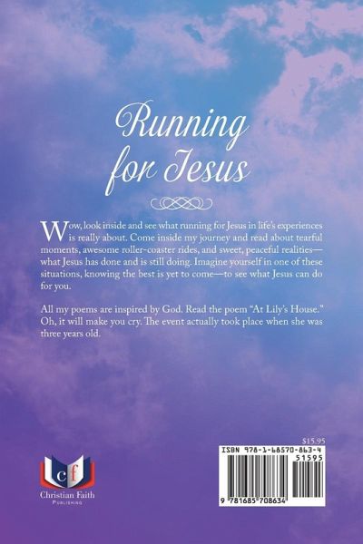 Wow, look inside and see what running for Jesus in life's experiences is really about. Come inside my journey and read about tearful moments, awesome roller-coaster rides, and sweet, peaceful realities--what Jesus has done and is still doing. Imagine yourself in one of these situations, knowing the best is yet to come--to see what Jesus can do for you. All my poems are inspired by God. Read the poem "At Lily's House." Oh, it will make you cry. The event actually took place when she was three years old.