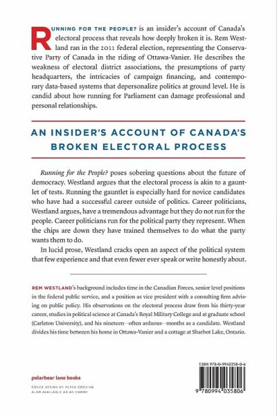 Running for the People? is an insider's account of Canada's electoral process that reveals how deeply broken it is. Rem Westland ran in the 2011 federal election, representing the Conservative Party of Canada in the riding of Ottawa-Vanier. He describes the weakness of electoral district associations, the presumptions of party headquarters, the intricacies of campaign financing, and contemporary data-based systems that depersonalize politics at ground level. He is candid about how running for Parliament can damage professional and personal relationships. Running for the People? poses sobering questions about the future of democracy. Westland argues that the electoral process is akin to a gauntlet of tests. Running the gauntlet is especially hard for novice candidates who have had a successful career outside of politics. Career politicians, Westland argues, have a tremendous advantage but they do not run for the people. Career politicians run for the political party they represent. When the chips are down they have trained themselves to do what the party wants them to do. In lucid prose, Westland cracks open an aspect of the political system that few experience and that even fewer ever speak or write honestly about. REM WESTLAND's background includes time in the Canadian Forces, senior level positions in the federal public service, and a position as vice president with a consulting firm advising on public policy. His observations on the electoral process draw from his thirty-year career, studies in political science at Canada's Royal Military College and at graduate school (Carleton University), and his nineteen - often arduous - months as a candidate. Westland divides his time between his home in Ottawa-Vanier and a cottage at Sharbot Lake, Ontario. PRAISE FOR RUNNING FOR THE PEOPLE? "Rem Westland pulls no punches and holds nothing back in Running for the People? A successful professional for over four decades, the former military officer threw his hat into the ring as a Conservative Party of Canada candidate for the 2011 election. Running for the People? is must reading for anyone who is interested in looking at the Conservative Party of Canada from the inside and seeing how the big blue election machine functions." - Bill Oliver, Editor e-Veritas (the e-newsletter for the Royal Military College Club of Canada)