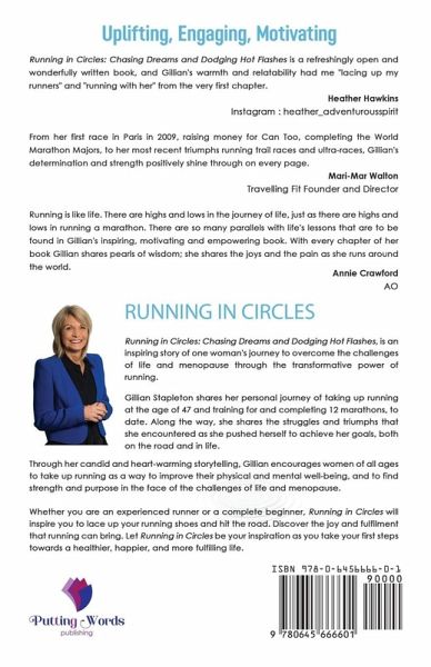 Running in Circles: Chasing Dreams and Dodging Hot Flashes. A Memoir of 12 Marathons and the Journey to Empowerment, is an inspiring story of one woman's journey to overcome the challenges of life and menopause through the transformative power of running. Gillian Stapleton shares her personal journey of taking up running at the age of 47 and training for and completing 12 marathons, to date. Along the way, she shares the struggles and triumphs that she encountered as she pushed herself to achieve her goals, both on the road and in life. Through her candid and heart-warming storytelling, Gillian encourages women of all ages to take up running as a way to improve their physical and mental well-being, and to find strength and purpose in the face of the challenges of life and menopause. Whether you are an experienced runner or a complete beginner, Running in Circles will inspire you to lace up your running shoes and hit the road. Discover the joy and fulfilment that running can bring. Let Running in Circles be your inspiration as you take your first steps towards a healthier, happier, and more fulfilling life.