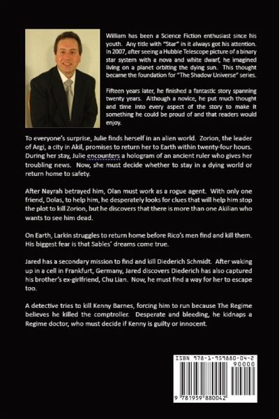 Based on a Hubble Telescope picture of a binary star system with a nova and white dwarf, "The Shadow Universe" series begins in the future, May 6, 2452, and includes six books: The Ways of Darkness, Running in the Shadows, Dawn of Darkness, Treasures of Darkness, Shadows of the Night, and When Darkness Falls. These books are for those who enjoy reading a fast-paced action-adventure space opera. Reading all six books is crucial because they do not stand alone, leaving cliffhangers at the end, except for When Darkness Falls, which concludes the story. As it evolves, many characters and plots tie together, and each one is essential to the outcome. Although set in a science fiction format, the saga is about people and our choices, so if you are not a science fiction fan but enjoy romance, suspense, action, and adventure, you may like this series as others have. The Shadow Universe II Running in the Shadows To everyone's surprise, Julie finds herself in an alien world. Zorion, the leader of Argi, a city in Akil, promises to return her to Earth within twenty-four hours, but during her stay, Julie meets a hologram of an ancient ruler who gives her troubling news. Now, she must decide whether to stay in a dying world or return home to safety. After Nayrah betrayed him, Olan must work as a rogue agent. With only one friend, Dolas, to help him, he desperately looks for clues that will help him stop the plot to kill Zorion, but he discovers that there is more than one Akilian who wants to see him dead. On Earth, Larkin struggles to return home before Rico's men find and kill them. His biggest fear is that Sables' dreams come true. Jared has a secondary mission to find and kill Diederich Schmidt. After waking up in a cell in Frankfurt, Germany, Jared discovers Diederich has also captured his brother's ex-girlfriend, Chu Lian. Now, he must find a way for her to escape too. A detective tries to kill Kenny Barnes, forcing him to run because The Regime believes he killed the comptroller. Desperate and bleeding, he kidnaps a Regime doctor, who must decide if Kenny is guilty or innocent.