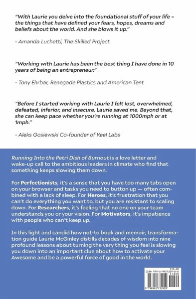 Running Into the Petri Dish of Burnout: A How Not-To Guide by Laurie McGinley is a guide for leaders in climate and other values-based sectors to avoid burnout by understanding its causes and how it manifests differently in individuals. The book emphasizes that those driven by love and a desire to do good are susceptible to a unique type of burnout. It argues that qualities that enable people to lead the world into a brighter future can also lead them into burnout. The book is for leaders, defined as C-suite employees, founders, directors, and those in supporting roles within climate-oriented…mehr