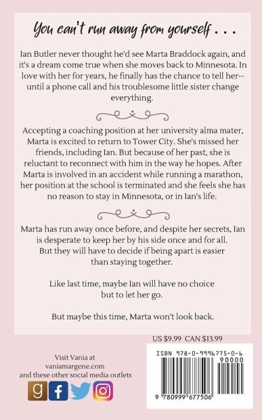 You can't run away from yourself . . . Ian Butler never thought he'd see Marta Braddock again, and it's a dream come true when she moves back to Minnesota. In love with her for years, he finally has the chance to tell her-until a phone call and his troublesome little sister change everything. Accepting a coaching position at her university alma mater, Marta is excited to return to Tower City. She's missed her friends, including Ian. But because of her past, she is reluctant to reconnect with him in the way he hopes. After Marta is involved in an accident while running a marathon, her position at the school is terminated and she feels she has no reason to stay in Minnesota, or Ian's life. Marta has run away once before, and despite her secrets, Ian is desperate to keep her by his side once and for all. But they will have to decide if being apart is easier than staying together.Like last time, maybe Ian will have no choice but to let her go.But maybe this time, Marta won't look back.