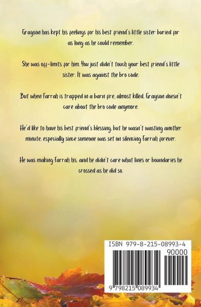 Grayson has kept his feelings for his best friend's little sister buried for as long as he could remember. She was off-limits for him. You just didn't touch your best friend's little sister. It was against the bro code. But when Farrah is trapped in a barn fire, almost killed, Grayson doesn't care about the bro code anymore. He'd like to have his best friend's blessing, but he wasn't wasting another minute, especially since someone was set on silencing Farrah forever. He was making Farrah his, and he didn't care what lines or boundaries he crossed as he did so. **This is the second book in the Love In Autumn series. It is written as a standalone with a HEA.**