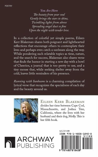 You Are Here The beauty from your soul Gently brings the stars to shine, Twinkling lights from above Spreading angel dust so fine Upon the night with tender love. In a collection of colorful yet simple poems, Eileen Kerr Blakeman shares both poignant and lighthearted reflections that encourage others to contemplate their lives and perhaps even catch a sunbeam along the way. While pondering such relatable topics as time, nature, and the search for success, Blakeman also shares verse that finds the humor in starting a new day with a bowl of Cheerios, a journal that is too pretty to use, and a tiny mouse that, while seeking shelter away from the cold, leaves little reminders of his presence. Running with Sunbeams is a charming compilation of lyrical verse that recognizes the specialness of each day and the beauty around us.