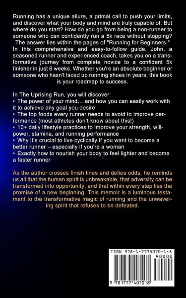 Running has a unique allure, a primal call to push your limits, and discover what your body and mind are truly capable of. But where do you start? How do you go from being a non-runner to someone who can confidently run a 5k race without stopping? The answer lies within the pages of "Running for Beginners." In this comprehensive and easy-to-follow guide, John, a seasoned runner and experienced coach, takes you on a transformative journey from complete novice to a confident 5k finisher in just 6 weeks. Whether you're an absolute beginner or someone who hasn't laced up running shoes in years, this book is your roadmap to success. In The Uprising Run, you will discover:The power of your mind... and how you can easily work with it to achieve any goal you desire The top foods every runner needs to avoid to improve performance (most athletes don't know about this!) 10+ daily lifestyle practices to improve your strength, willpower, stamina, and running performance Why it's crucial to live cyclically if you want to become a better runner - especially if you're a woman Exactly how to nourish your body to feel lighter and become a faster runner As the author crosses finish lines and defies odds, he reminds us all that the human spirit is unbreakable, that adversity can be transformed into opportunity, and that within every step lies the promise of a new beginning. This memoir is a luminous testament to the transformative magic of running and the unwavering spirit that refuses to be defeated.