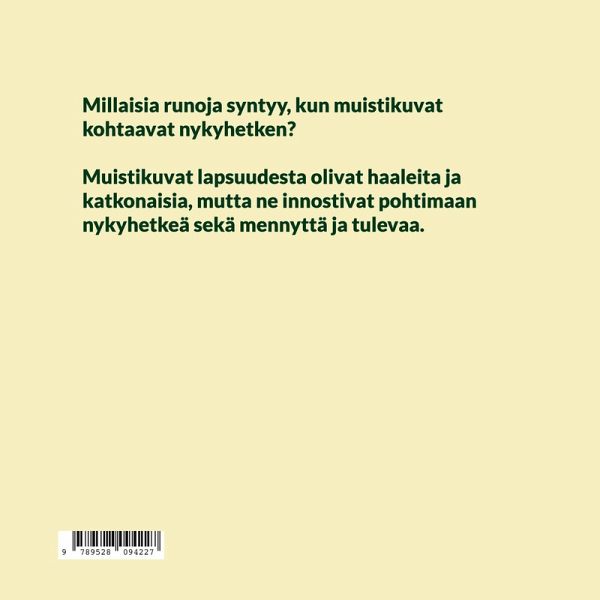 Millaisia runoja syntyy, kun muistikuvat kohtaavat nykyhetken? Muistikuvat lapsuudesta olivat haaleita ja katkonaisia, mutta ne innostivat pohtimaan nykyhetkeä sekä mennyttä ja tulevaa.