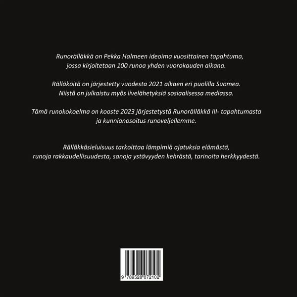 Runorälläkkä on Pekka Halmeen ideoima vuosittainen tapahtuma, jossa kirjoitetaan 100 runoa yhden vuorokauden aikana. Rälläköitä on järjestetty vuodesta 2021 alkaen eri puolilla Suomea. Tämä runokokoelma on kooste 2023 järjestetystä Runorälläkkä III- tapahtumasta ja kunnianosoitus edesmenneelle runoveljellemme.