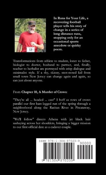 In Runs for Your Life, a recovering football player tells his story of change in a series of long distance runs, stopping only for an occasional sports anecdote or quirky poem. Transformations from athlete to student, loner to father, biologist to doctor, husband to partner, and, finally, teacher to herbalist are portrayed with crisp dialogue and minimalist style. If a shy, skinny, snot-nosed kid from small town New Jersey can change again and again, so can just about anyone.