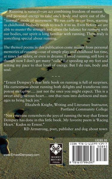 Running is natural-an act combining freedom of motion and personal energy to take one's body and spirit out of the "normal" mode of movement. We run early in our lives, starting in childhood. Nobody needs to teach it to us. Even before we are able to muster the strength and attain the balance for running with our bodies, our spirit is long familiar with running. There truly is something special about running. The themed poems in this publication come mainly from personal memories of running-out of simple play and childhood fun time, at times for safety, or even in dreams. I loved running; still love it though now I don't get many "calls" for speeding up my feet and setting my pace to that level of energy. But I do run, body and soul. "Ernest Dempsey's dear little book on running is full of surprises. His earnestness about running both delights and transforms into potent metaphor…. just not the ones you might expect. This is a sweet and generous heart… one that runs into darkness and manages to bring back joy." -- Elizabeth Knight, Writing and Literature Instructor, Portland Community College "Not everyone remembers the joys of running the way that Ernest Dempsey has done in this little book. My favorite poem is 'Racing Heart.' Kudos to Ernest." -- RD Armstrong, poet, publisher and dog about town