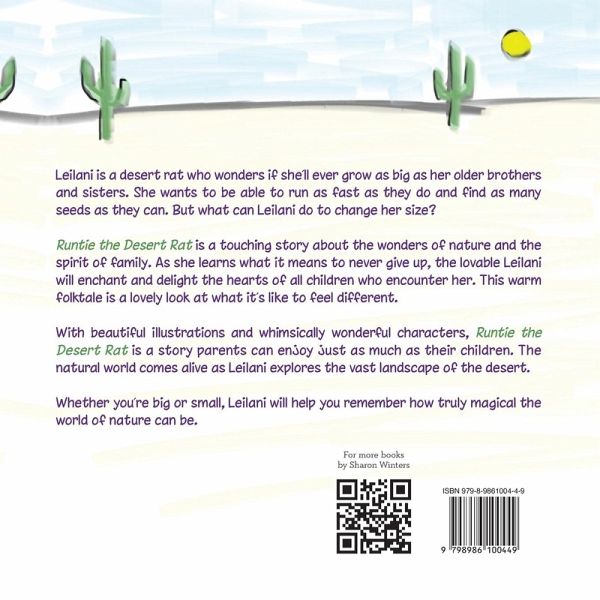 Leilani is a desert rat who wonders if she'll ever grow as big as her older brothers and sisters. She wants to be able to run as fast as they do and find as many seeds as they can. But what can Leilani do to change her size? Runtie the Desert Rat is a touching story about the wonders of nature and the spirit of family. As she learns what it means to never give up, the lovable Leilani will enchant and delight the hearts of all children who encounter her. This warm folktale is a lovely look at what it's like to feel different. With beautiful illustrations and whimsically wonderful characters, Runtie the Desert Rat is a story parents can enjoy just as much as their children. The natural world comes alive as Leilani explores the vast landscape of the desert. Whether you're big or small, Leilani will help you remember how truly magical the world of nature can be.