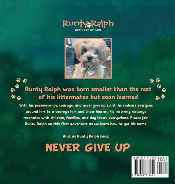 Runty Ralph was born stillborn and so tiny. He was helped to breathe and although he was way smaller than the rest of his littermates , he soon learned to keep going no matter what. With his perseverance, courage, and never give up spirit, he endears everyone around him to encourage him and cheer him on. His inspiring message resonates with children, families, and dog lovers everywhere. Please join Runty Ralph on this first adventure as we learn how he got his name. And, as Runty Ralph says, "NEVER GIVE UP!".