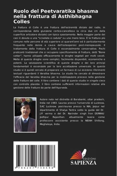 La frattura di Colle è una frattura dell'estremità distale del radio, in corrispondenza della giunzione cortico-cancellosa (a circa due cm dalla superficie articolare distale) con tipico spostamento. Nella maggior parte dei casi è dovuta a una "scivolata e caduta" su una mano tesa. È la frattura più comune nelle persone di età superiore ai quarant'anni ed è particolarmente frequente nelle donne a causa dell'osteoporosi post-menopausale. Il trattamento della frattura di Colle è essenzialmente conservativo. Pochi praticanti tradizionali che si occupano specificamente di fratture, detti "Bone setter", hanno utilizzato efficacemente le droghe vegetali per molti secoli. Molte di queste droghe sono semplici, facilmente disponibili, economiche e potenti. La valutazione scientifica di queste droghe e dei loro principi fondamentali è essenziale per la loro accettazione universale. In questo studio si è quindi cercato di preparare un farmaco di cui esistono riferimenti testuali riguardanti il Varatika bhasma. Lo studio ha cercato di dimostrare l'efficacia del Varatika bhasma per la mobilizzazione precoce nella gestione delle fratture del colle. Il libro contiene i dati di questo studio in singolo cieco con controllo placebo. il libro contiene sufficienti informazioni relative alla gestione delle fratture da parte dell'Ayurveda.