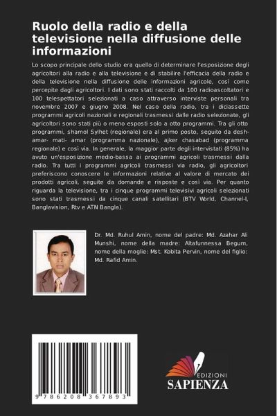 Lo scopo principale dello studio era quello di determinare l'esposizione degli agricoltori alla radio e alla televisione e di stabilire l'efficacia della radio e della televisione nella diffusione delle informazioni agricole, così come percepite dagli agricoltori. I dati sono stati raccolti da 100 radioascoltatori e 100 telespettatori selezionati a caso attraverso interviste personali tra novembre 2007 e giugno 2008. Nel caso della radio, tra i diciassette programmi agricoli nazionali e regionali trasmessi dalle radio selezionate, gli agricoltori sono stati più o meno esposti solo a otto programmi. Tra gli otto programmi, shamol Sylhet (regionale) era al primo posto, seguito da desh- amar- mati- amar (programma nazionale), ajker chasabad (programma regionale) e così via. In generale, la maggior parte degli intervistati (85%) ha avuto un'esposizione medio-bassa ai programmi agricoli trasmessi dalla radio. Tra tutti i programmi agricoli trasmessi via radio, gli agricoltori preferiscono conoscere le informazioni relative al valore di mercato dei prodotti agricoli, seguite da domande e risposte e così via. Per quanto riguarda la televisione, tra i cinque programmi televisivi agricoli selezionati sono stati trasmessi da cinque canali satellitari (BTV World, Channel-I, Banglavision, Rtv e ATN Bangla).