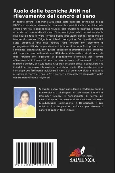 In questo lavoro le tecniche ANN sono state applicate all'insieme di dati WBCD e sono state calcolate l'accuratezza, la sensibilità e la specificità delle diverse reti, tra le quali la rete neurale feed forward ha ottenuto la migliore accuratezza rispetto alle altre reti. Si è quindi giunti alla conclusione che la rete neurale feed forward fornisce buone prestazioni per la rilevazione del tumore al seno con l'algoritmo di back propagation. Con questi risultati è stata progettata una rete neurale feed forward con algoritmo di propagazione all'indietro per rilevare il tumore al seno in fase precoce per l'efficienza diagnostica, con questo successo la probabilità della presenza del tumore al seno utilizzando una RNA che è stata addestrata da una rete feed forward con algoritmo di propagazione all'indietro per rilevare efficacemente il tumore al seno in fase precoce differenziando tra casi maligni e benigni, con tutti questi rapporti l'oncologo arriva a concludere che il nodulo è canceroso e la paziente ne è stata colpita. Con questo processo l'oncologo può facilmente individuare il cancro al seno. Ciò aiuterà le pazienti a trattare il cancro al seno in fase precoce e l'accuratezza diagnostica potrà essere notevolmente migliorata.