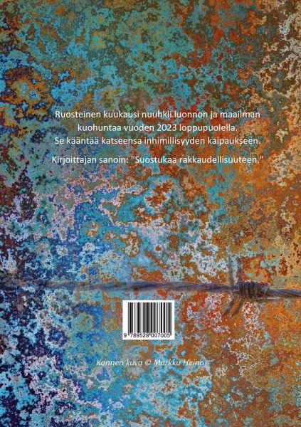 Ruosteinen kuukausi on kirjoittajan 25:s runokokoelma. Heino kutoo herkästi ja hauskasti elämän ihmettelyn rakkaudellisuuden kaavuksi, jonka alla on hyvä miettiä ympäröivää maailmaa ja sen metkuja.