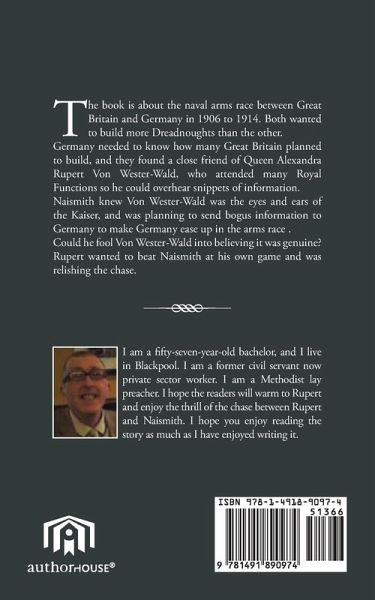 The book is about the naval arms race between Great Britain and Germany in 1906 to 1914. Both wanted to build more Dreadnoughts than the other. Germany needed to know how many Great Britain planned to build, and they found a close friend of Queen Alexandra Rupert Von Wester-Wald, who attended many Royal Functions so he could overhear snippets of information. Naismith knew Von Wester-Wald was the eyes and ears of the Kaiser, and was planning to send bogus information to Germany to make Germany ease up in the arms race . Could he fool Von Wester-Wald into believing it was genuine? Rupert wanted to beat Naismith at his own game and was relishing the chase.