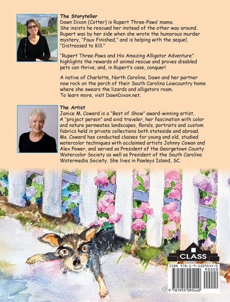Rupert, a rescued three-legged Chihuahua, sneaks out of his yard to visit his good friend Ally Gator whose babies should be about ready to hatch. He trots on his three legs, visiting friends along the way on Front Street in Georgetown, South Carolina. He has people friends and bird friends and squirrel friends and rooster friends, but he is on a mission to protect his best friend's nest from raccoons and snakes and bobcats. Despite missing one leg, Rupert is successful in helping Ally move her new babies from the nest to the water, and in the process, he conquers his fear of the boardwalk and the river beneath it. And he gets home safely before dinner!