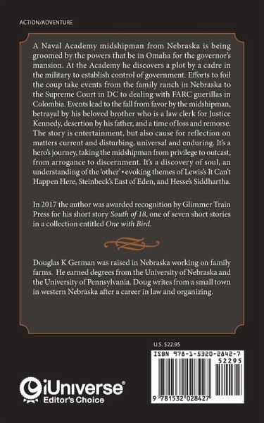 A Naval Academy midshipman from Nebraska is being groomed by the powers that be in Omaha for the governor’s mansion. At the Academy he discovers a plot by a cadre in the military to establish control of government. Efforts to foil the coup take events from the family ranch in Nebraska to the Supreme Court in DC to dealing with FARC guerillas in Colombia. Events lead to the fall from favor by the midshipman, betrayal by his beloved brother who is a law clerk for Justice Kennedy, desertion by his father, and a time of loss and remorse. The story is entertainment, but also cause for reflection on matters current and disturbing, universal and enduring. It’s a hero’s journey, taking the midshipman from privilege to outcast, from arrogance to discernment. It’s a discovery of soul, an understanding of the ‘other’•evoking themes of Lewis’s It Can’t Happen Here, Steinbeck’s East of Eden, and Hesse’s Siddhartha. In 2017 the author was awarded recognition by Glimmer Train Press for his short story South of 18, one of seven short stories in a collection entitled One with Bird.