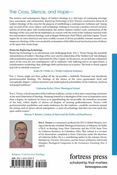 Rupturing Eschatology is Eric Trozzos constructive retrieval of Luthers theology of the cross seeking to establish a contemporary Lutheran and emerging account of the cross, silence, and eschatology. The book explores Luthers early theology of the cross and divine hiddenness in concert with the work of the Lutheran mystical tradition and modern Lutheran theology. Trozzo argues for an account of divine possibility oriented around a contemporary theology of the cross marked by reclamation of the biblical and mystical practice of silence as the space that creates hope.