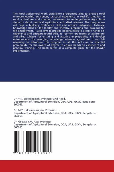 The Rural agricultural work experience programme aims to provide rural entrepreneurship awareness, practical experience in real-life situation in rural agriculture and creating awareness to undergraduate Agriculture students about practical agriculture and allied sciences. The programme will help in building confidence, skill and acquire Indigenous Technical Knowledge (ITK) of the locality and thereby, preparing the pass-out for self-employment. It also aims to provide opportunities to acquire hands-on-experience and entrepreneurial skills. To reorient graduates of agriculture and allied subjects for ensuring and assuring employ-ability and develop entrepreneurs for emerging knowledge intensive agriculture, it was felt necessary to introduce this program in all the AU's as an essential prerequisite for the award of degree to ensure hands on experience and practical training. This book serves as a complete guide for the RAWEP implementers.