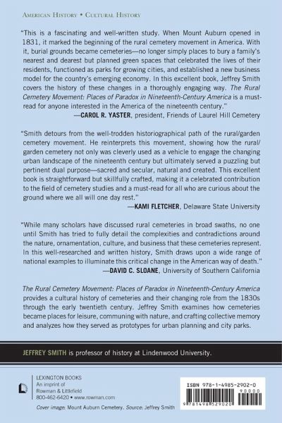 When Mount Auburn opened as the first "rural" cemetery in the United States in 1831, it represented a new way for Americans to think about burial sites. It broke with conventional notions about graveyards as places to bury and commemorate the dead. Rather, the founders of Mount Auburn and the spate of similar cemeteries that followed over the next three decades before the Civil War created institutions that they envisioned being used by the living in new ways. Cemeteries became places for leisure, communing with nature, and creating a version of collective memory. In fact, these cemeteries reflected changing values and attitudes of Americans spanning much of the nineteenth century. In the process, they became paradoxical: they were "rural" yet urban, natural yet designed, artistic yet industrial, commemorating the dead yet used by the living. The Rural Cemetery Movement: Places of Paradox in Nineteenth-Century America breaks new ground in the history of cemeteries in the nineteenth century. This book examines these "rural" cemeteries modeled after Mount Auburn that were founded between the 1830s and 1850s. As such, it provides a new way of thinking about these spaces and new paradigm for seeing and visiting them. While they fulfilled the sacred function of burial, they were first and foremost businesses. The landscape and design, regulation of gravestones, appearance, and rhetoric furthered their role as a business that provided necessary services in cities that went well beyond merely burying bodies. They provided urban green spaces and respites from urban life, established institutions where people could craft their roles in collective memory, and served as prototypes for both urban planning and city parks. These cemeteries grew and thrived in the second half of the nineteenth century; for most, the majority of their burials came before 1910. This expansion of cemeteries coincided with profound urban growth in the United States. Unlike their predecessors, founders of these burial grounds intended them to be used in many ways that reflected their views and values about nature, life and death, and relationships. Emphasis on worldly accomplishments increased with industrialization and growth in the United States, which was reflected in changing ways people commemorated their dead during the period under this study. Thus, these cemeteries are a prism through which to understand the values, attitudes, and culture of urban America from mid-century through the Progressive Era.