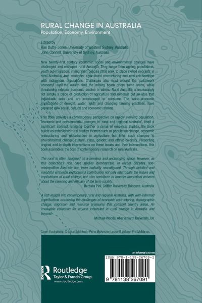 1: Introduction 2: The Role of Gender in the Migration Practices and Aspirations of Australian Rural Youth 3: Urban to Rural Elderly Migration 4: Immigrant Settlement in Regional Australia 5: 'They have no concept of what a farm is' 6: Difference or Equality? Settlement Dilemmas on the Indigenous Estate 7: Challenging Mining Workforce Practices 8: Trajectories of Change in Rural Landscapes 9: Water Reform in the 21st Century 10: Rural Place Marketing, Tourism and Creativity 11: Soft Country? Rural and Regional Australia in Country Style 12: 'Not just drought.' Drought, Rural Change and More 13: Evolving Metabolic Relations