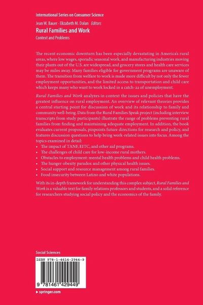 RURAL FAMILIES and WORK OVERVIEW.- THEORIES FOR STUDYING RURAL FAMILIES AND WORK.- RURAL DOES MATTER: UNDERSTANDING THE RURAL CONTEXT.-MAKING RURAL EMPLOYMENT WORK.-PHYSICAL HEALTH, FOOD SECURITY, AND ECONOMIC WELL-BEING: THE RURAL PERSPECTIVE.- INVISIBLE BARRIERS TO EMPLOYMENT: MENTAL AND BEHAVIORAL HEALTH PROBLEMS THAT HINDER SELF-SUFFICIENCY.-THE CHALLENGE OF CHILD CARE FOR RURAL LOW-INCOME MOTHERS.- RESOURCES AS THE KEY TO RURAL EMPLOYMENT.-"I DON'T KNOW HOW WE WOULD MAKE IT" - SOCIAL SUPPORT IN RURAL LOW-INCOME FAMILIES.- THE EARNED INCOME TAX CREDIT: AN INCENTIVE TO RURAL EMPLOYMENT.- APPLICATIONS FOR THE RFS FINDINGS: PROGRAMS AND FUTURE RESEARCH.- POLICY ISSUES AND APPLICATIONS: RURAL CONCERNS.- Appendix A: A BRIEF HISTORY OF RURAL FAMILIES SPEAK PROJECT.- Appendix B: RURAL FAMILIES SPEAK WORK CITED.