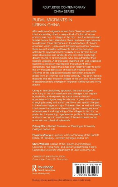 After millions of migrants moved from China's countryside into its sprawling cities a unique kind of 'informal' urban enclave was born - 'villages in the city'. Like the shanties and favelas before them elsewhere, there has been huge pressure to redevelop these blemishes to the urban face of China's economic vision. Unlike most developing countries, however, these are not squatter settlements but owner-occupied settlements developed semi-formally by ex-farmers turned small-developers and landlords who rent shockingly high-density rooms to rural migrants, who can outnumber their landlord villagers. A strong state, matched with well-organised landlords collectively represented through joint-stock companies, has meant that it has been relatively easy to grow the city through demolition of these soft migrant enclaves. The lives of the displaced migrants then enter a transient phase from an informal to a formal urbanity. This book looks at migrants and their enclave 'villages in the city' and reveals the characteristics and changes in migrants' livelihoods and living places. Using an interdisciplinary approach, the book analyses how living in the city transforms and changes rural migrant households, and explores the social lives and micro economies of migrant neighbourhoods. It goes on to discuss changing housing and social conditions and spatial changes in the urban villages of major Chinese cities, as well as looking into transient urbanism and examining the consequences of redevelopment and upgrading of the 'villages in the city'; in particular, the planning, regeneration, politics of development, and socio-economic implications of these immense social, economic and physical upheavals.