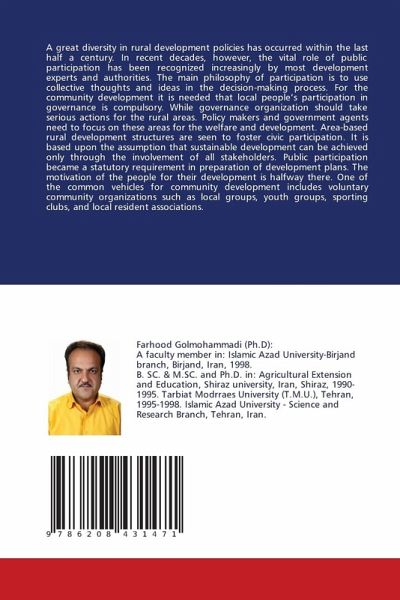 A great diversity in rural development policies has occurred within the last half a century. In recent decades, however, the vital role of public participation has been recognized increasingly by most development experts and authorities. The main philosophy of participation is to use collective thoughts and ideas in the decision-making process. For the community development it is needed that local people's participation in governance is compulsory. While governance organization should take serious actions for the rural areas. Policy makers and government agents need to focus on these areas for the welfare and development. Area-based rural development structures are seen to foster civic participation. It is based upon the assumption that sustainable development can be achieved only through the involvement of all stakeholders. Public participation became a statutory requirement in preparation of development plans. The motivation of the people for their development is halfway there.One of the common vehicles for community development includes voluntary community organizations such as local groups, youth groups, sporting clubs, and local resident associations.