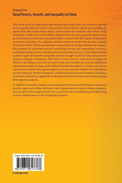 This book aims to empirically and theoretically study how the economic growth and inequality affected China's rural poverty since China's reform and opening-up. Apart from the trickle-down effect, some empirical researches show that rising inequality usually links with unfairly shared of the economic growth, which is not good for the poor, and this book particularly concerns with the impact of inequality on poverty reduction. In 11 chapters, it leads readers to review the dynamic changes of rural poverty in China, and estimates rural poverty by various methods, for instance, with analysis by monetary poverty (including income and expenditure poverty), multidimensional poverty, absolute poverty, and relative poverty. Especially attention is paid to apply the "growth-inequality-poverty triangle" model for long-term poverty dynamic changes evaluation. The book revisits poverty reduction strategies in different development periods for rural China and evaluates the poverty eradicationachievements stage-by-stage under different analytical methods, in order to provide an objective assessment. Among the chapters, pro-poor growth, Shapley decomposition, poverty elasticity, density estimation, multidimensional poverty analysis, and policy simulation methods are applied for both national wide discussion and rural sub-group heterogeneity analysis. In addition to students, teachers, and researchers in the areas of development, economic growth, equity, and welfare, the book is also of great interest to policy makers, planners, and non-government agencies who are concerned with understanding and addressing poverty-related issues in the developing countries.