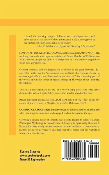 I found the working people of Frome very intelligent; very well informed as to the cause of their misery; not at all humbuggered by the canters, whether about religion or loyalty. -from "Salisbury to Highworth, Saturday, 2 September" Son of an innkeeper, former soldier, champion of the working class, early anticorporate activist, and future Member of Parliament-Will Cobbett's unique eye offers us a perspective on 19th-century England we won't find anywhere else. Cobbett roamed Southern England on horseback in the years between 1821 and 1832, gathering his "economical and political observations relative to matters applicable to, and illustrated by, the state of" that charming part of the world, one in the throes of massive change in the wake of the Industrial Revolution. This is an extraordinary record of a world long gone, one very little documented when it existed, by a voice who was far ahead of his time. British journalist and radical WILLIAM COBBETT (1762-1835) is also the author of The Progress of a Ploughboy to a Seat in Parliament (1830).