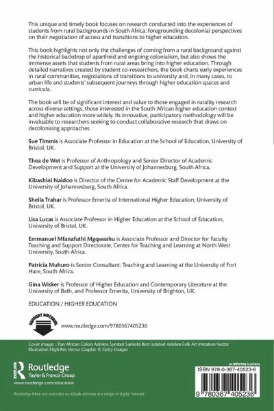 This unique and timely book focuses on research conducted into the experiences of students from rural backgrounds in South Africa; foregrounding decolonial perspectives on their negotiation of access and transitions to higher education.